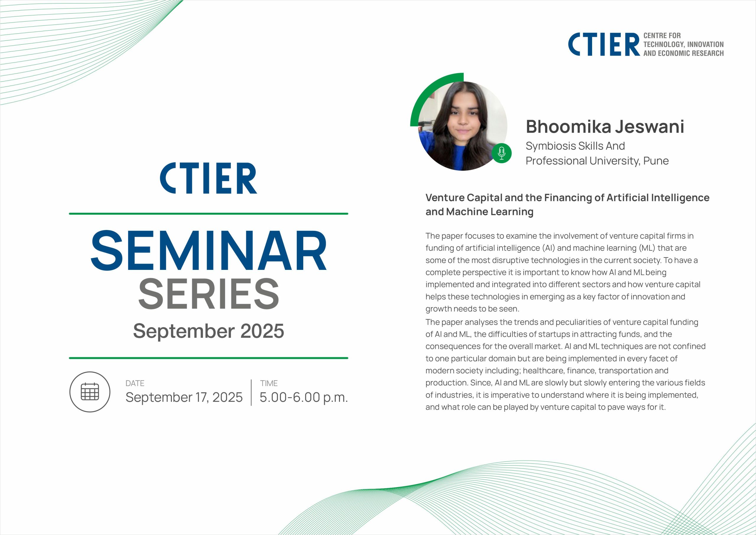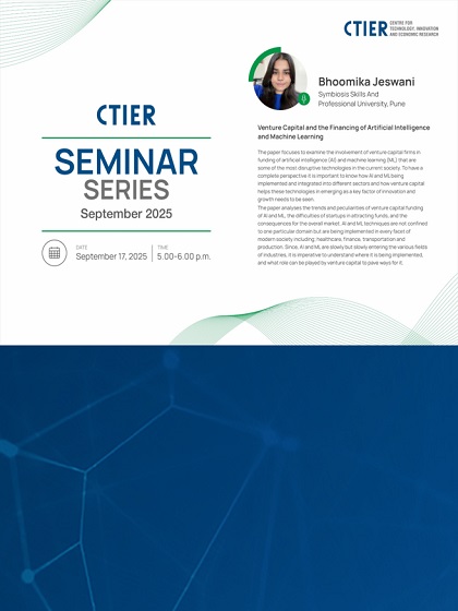 Bhoomika Jeswani from Symbiosis Skills and Professional University, Pune presented her work at the CTIER Seminar Series.
