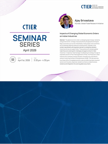 Ajay Srivastava, founder of the Global Trade Research Initiative, spoke on “Impacts of Changing Global Economic Order on Indian Industries” at the CTIER Seminar Series (April session). He discussed how recent shifts in the global economic landscape are reshaping trade and supply chains, analysed the challenges and opportunities for India as the global economic order evolves, and highlighted the strategies needed to remain competitive.