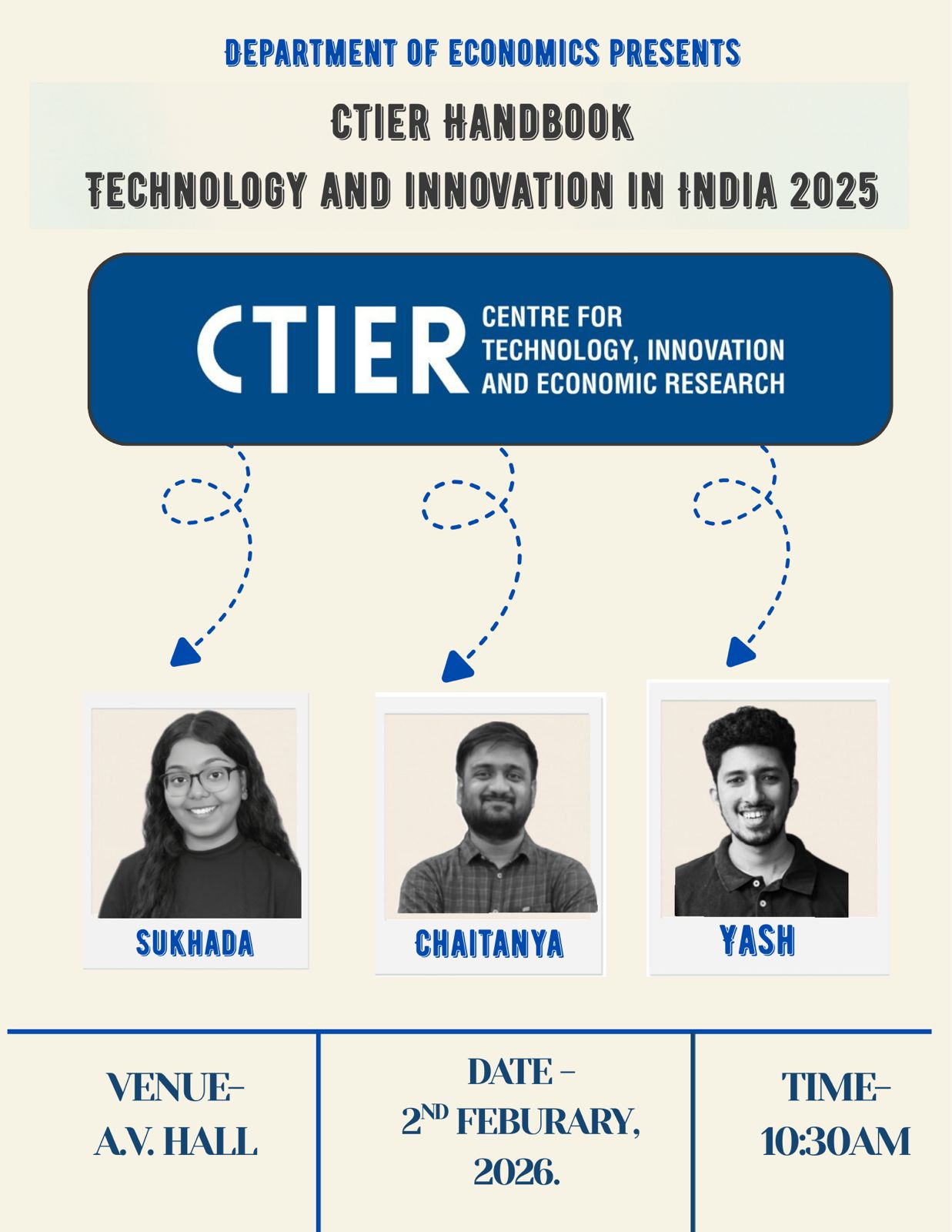 CTIER team conducted an outreach session on the CTIER Handbook: Technology and Innovation in India at Symbiosis School of Economics. The session brought together students for an in-depth conversation spanning some of the most pressing themes in the Handbook including India's evolving innovation landscape, regional innovation ecosystems, industrial R&D in India, the global transition in innovation leadership, and India's semiconductor ambitions.