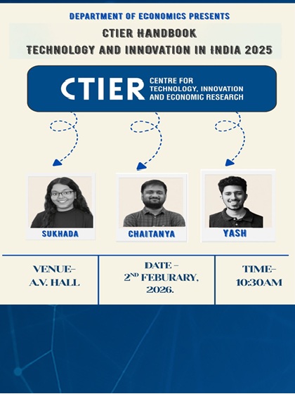 CTIER team conducted an outreach session on the CTIER Handbook: Technology and Innovation in India at Fergusson College. The session brought together students for an in-depth conversation spanning some of the most pressing themes in the Handbook including India's evolving innovation landscape, regional innovation ecosystems, industrial R&D in India, the global transition in innovation leadership, and India's semiconductor ambitions.