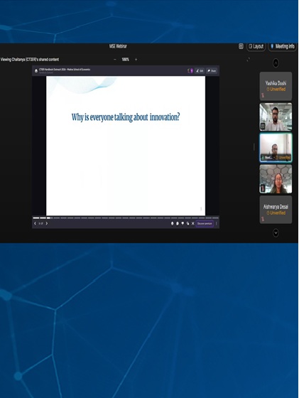 CTIER team conducted an outreach session on the CTIER Handbook: Technology and Innovation in India at Madras School of Economics (MSE). The session brought together a curious and engaged group of students for a wide-ranging conversation on some of the Handbook's core themes, from India's innovation ecosystem and the role of industrial R&D, to the shifting dynamics of global innovation leadership.