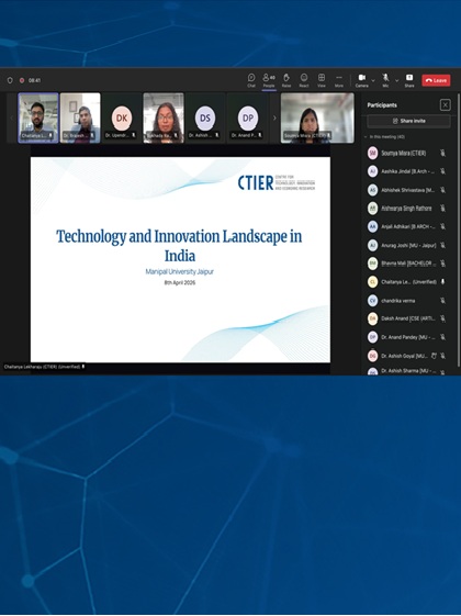 CTIER team conducted an outreach session on the CTIER Handbook: Technology and Innovation in India at Manipal University Jaipur (MUJ). The session brought together a curious and engaged group of students for a wide-ranging conversation on some of the Handbook's core themes, from India's innovation ecosystem and the role of industrial R&D, to the shifting dynamics of global innovation leadership.